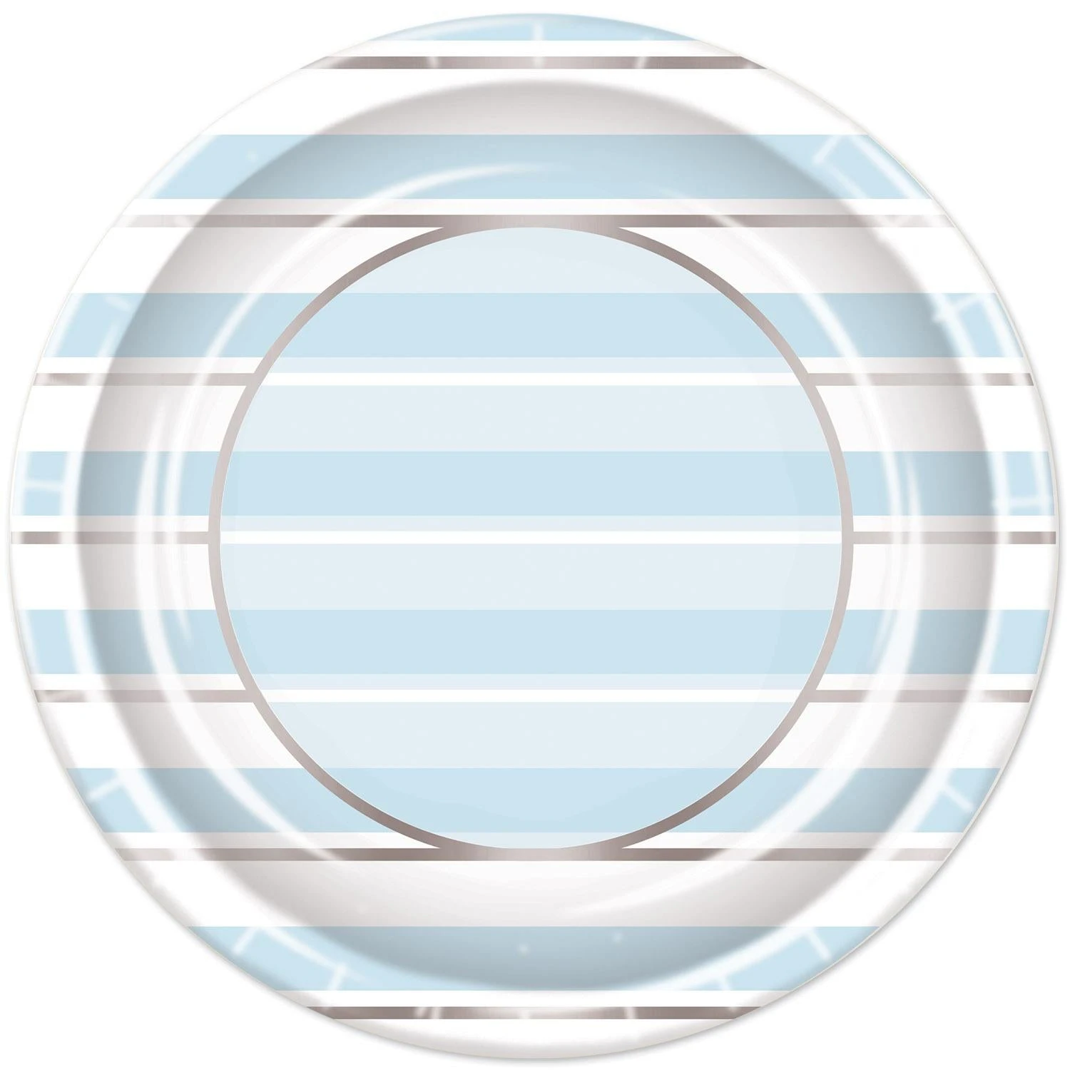 Product Description: Our Striped Plates – Boy are the perfect way to celebrate a special baby shower. The set includes 8 plates, each measuring 9 inches, in a classic combination of light blue, white, and silver. These plates are perfect for setting a beautiful table and will add the perfect touch to your special event. They are not microwave safe, but are a great selection for tableware. Plus, they ship from Pennsylvania warehouse within one business day! Part of Our Baby Shower Party Supplies line, these Striped Plates – Boy are a great addition to your special day.