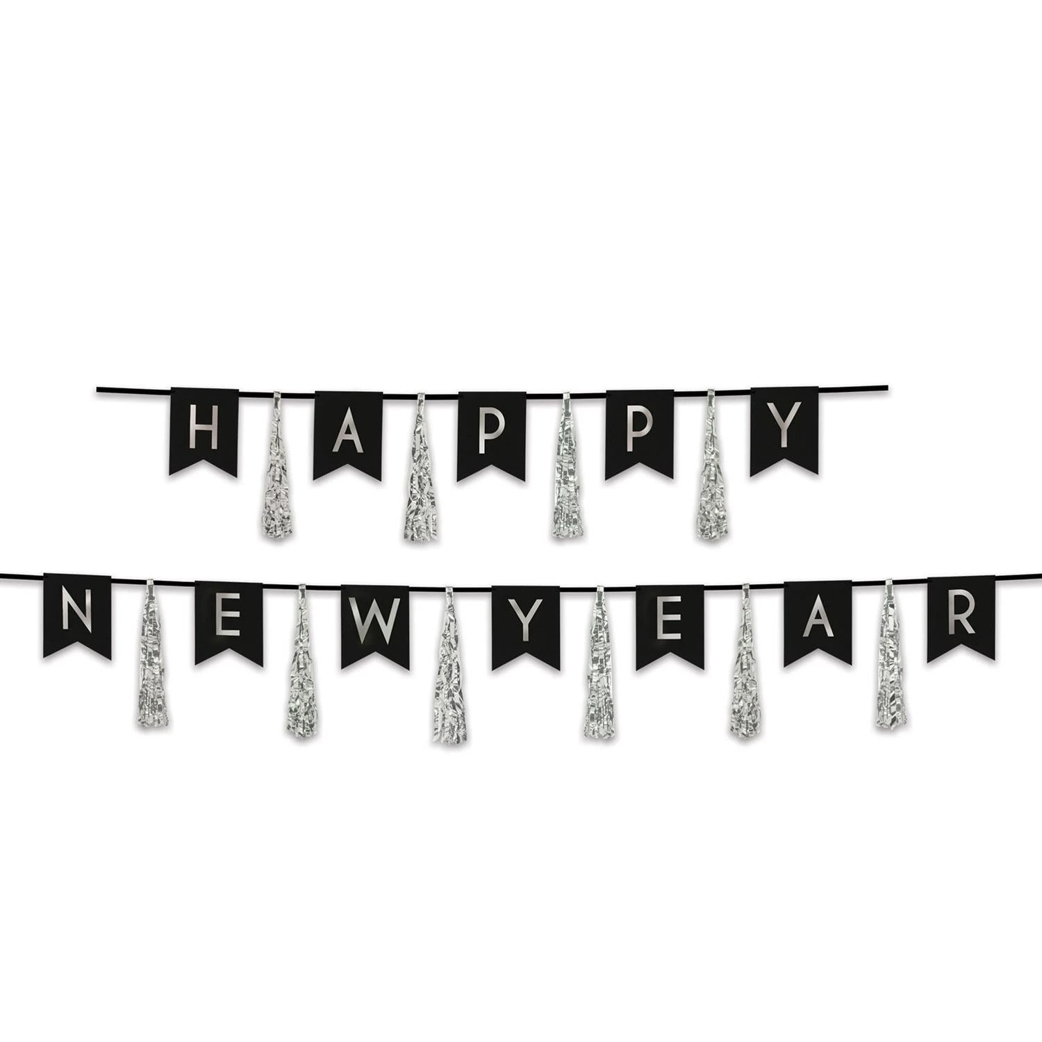 Product Description: Welcome the New Year with the Happy New Year Tassel Streamer from BulkPartySupplies.com! This two piece streamer is the perfect decoration for any New Year’s Eve party. The first piece reads “Happy” and the second piece reads “New Year”. The streamer is black and silver, and each piece measures 13 Inches x 6 Feet and 13 Inches x 9 Feet. It is easy to use, as you can either create one long streamer or use the pieces separately. This item is sure to be a hit with all your New Year’s Eve celebrations. Plus, it ships from our Pennsylvania warehouse within one business day, so you can get it quickly and easily. Make your New Year’s Eve party the best ever with the Happy New Year Tassel Streamer from BulkPartySupplies.com!