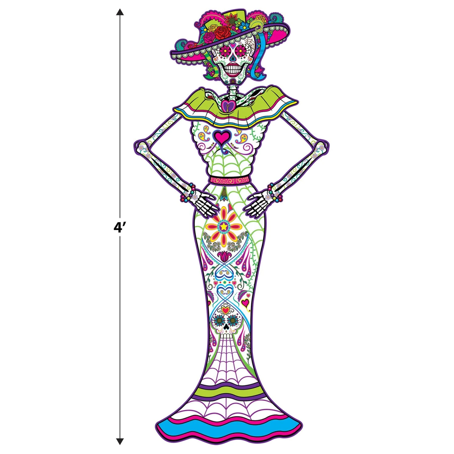 This Day of the Dead jointed female skeleton figure is printed on one side and comes in a 4″ size. Perfect for decorating your Day of the Dead celebration! Sold in packages of 1 with 12 packages per case.