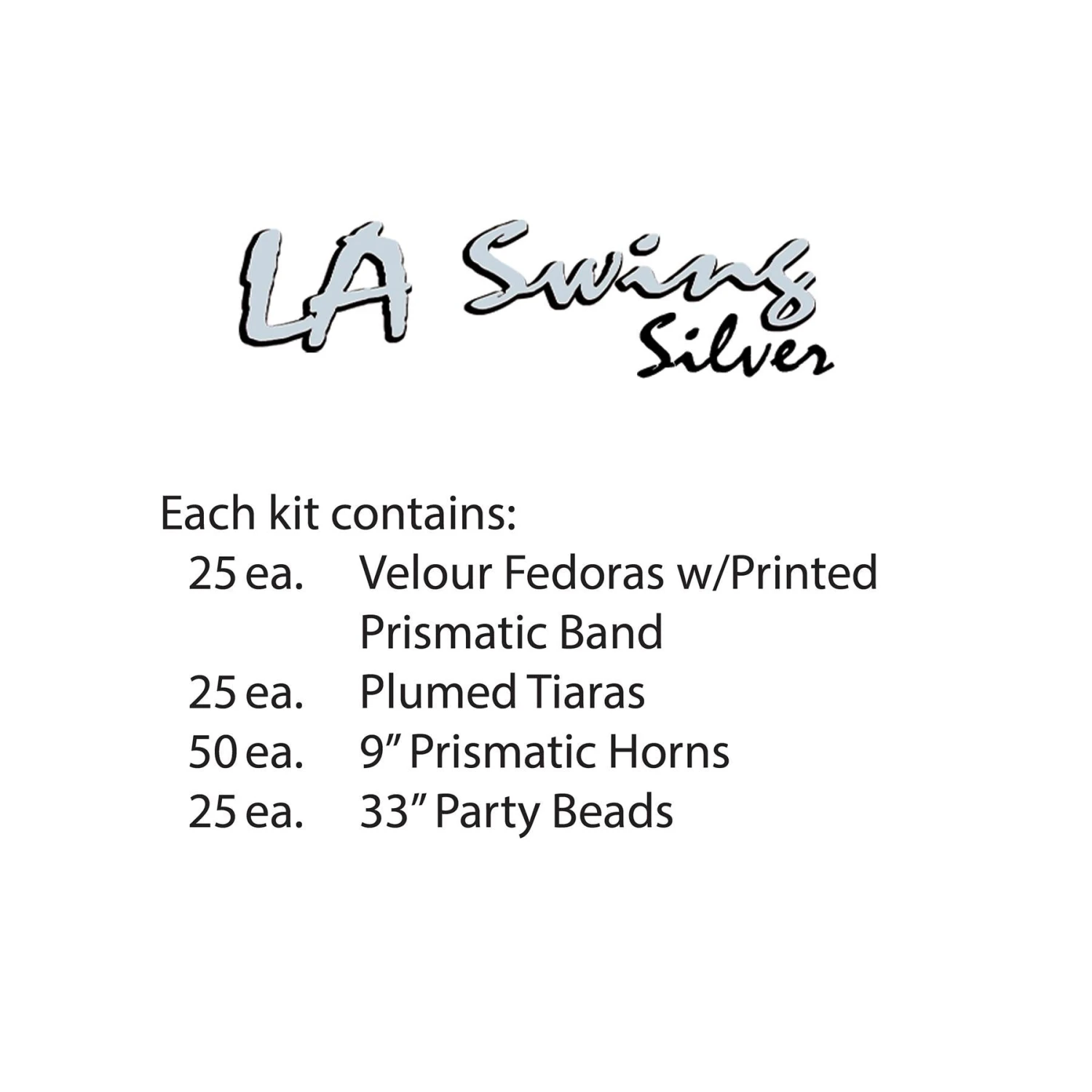 Celebrate in style with the LA Swing Silver New Year’s Eve Party Kit for 50 People from BulkPartySupplies.com! This kit provides everything you need to throw an unforgettable New Year’s Eve party, featuring velour fedoras, glittered plumed tiaras, prismatic horns, and party bead necklaces. With fast shipping from our Pennsylvania warehouse, your supplies will arrive in time for the festivities. Make your New Year’s Eve celebration truly memorable with the LA Swing Silver Party Kit!