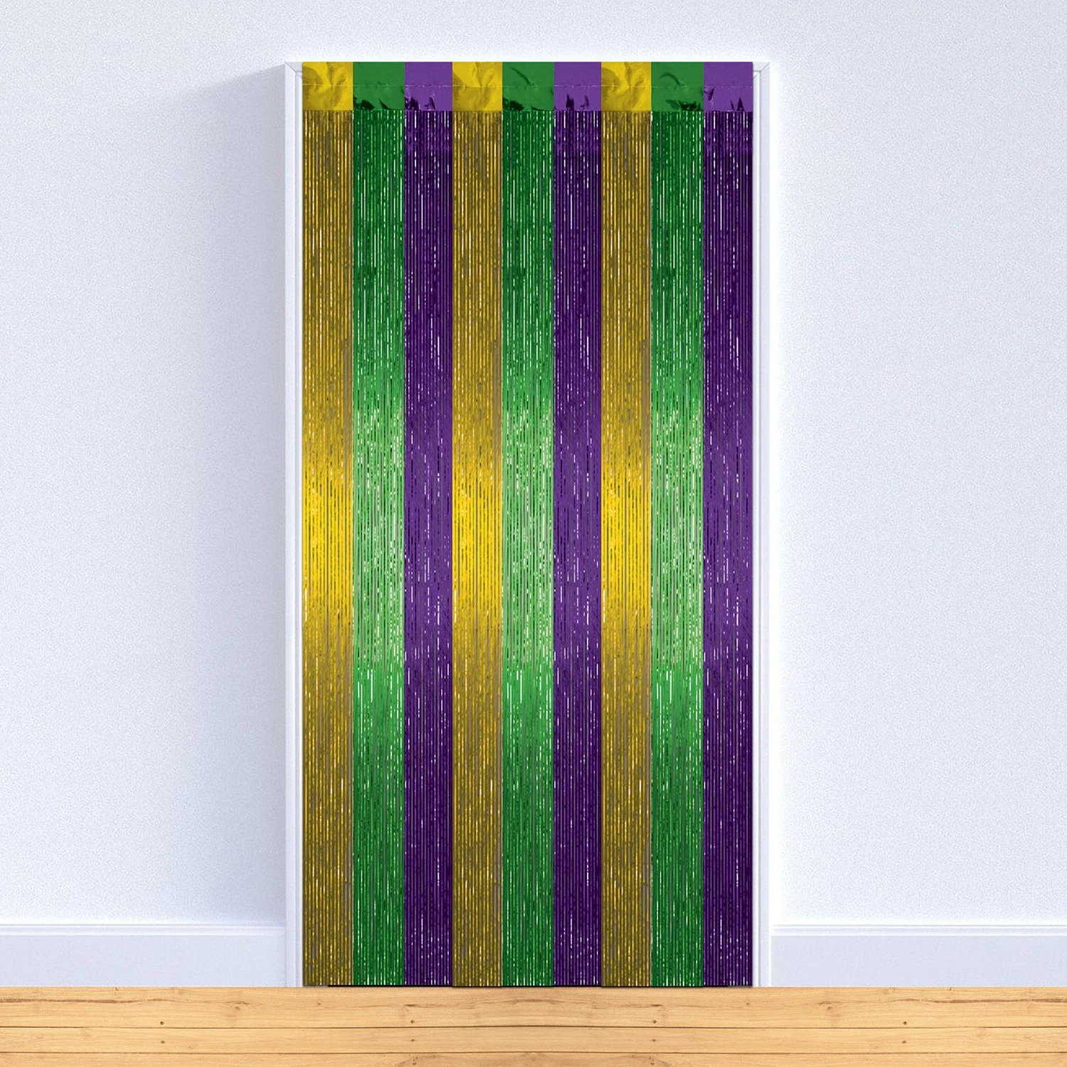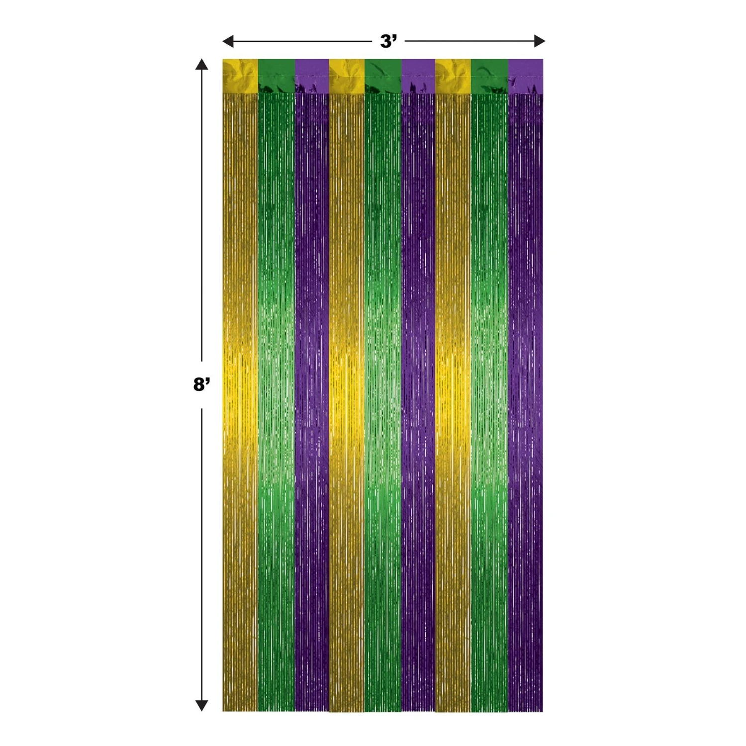 Details: Decorate your Mardi Gras Party with these gold green and purple Gleam ‘N Curtains! Size: 8’x 3’. Individually packaged: (1/package). Pieces/packages per Case: 6.