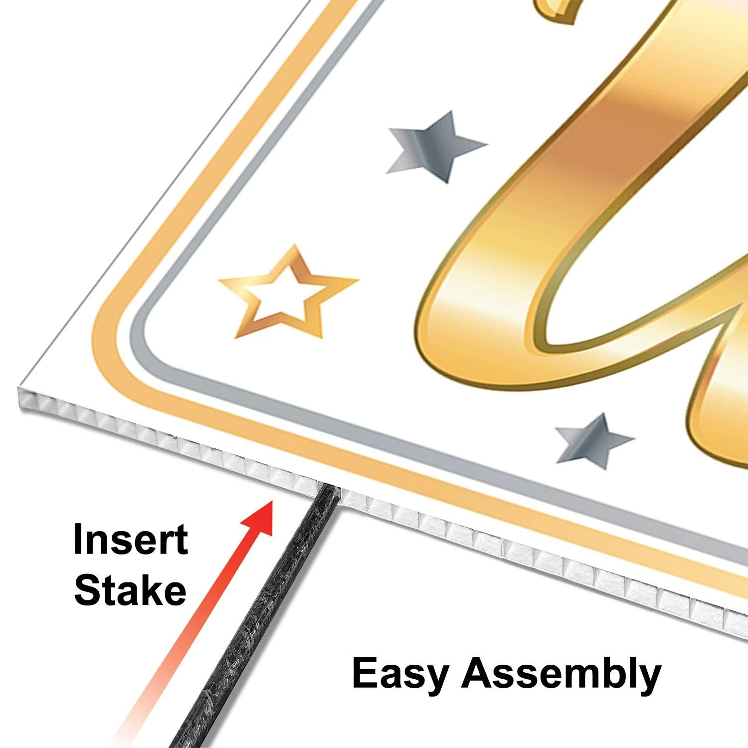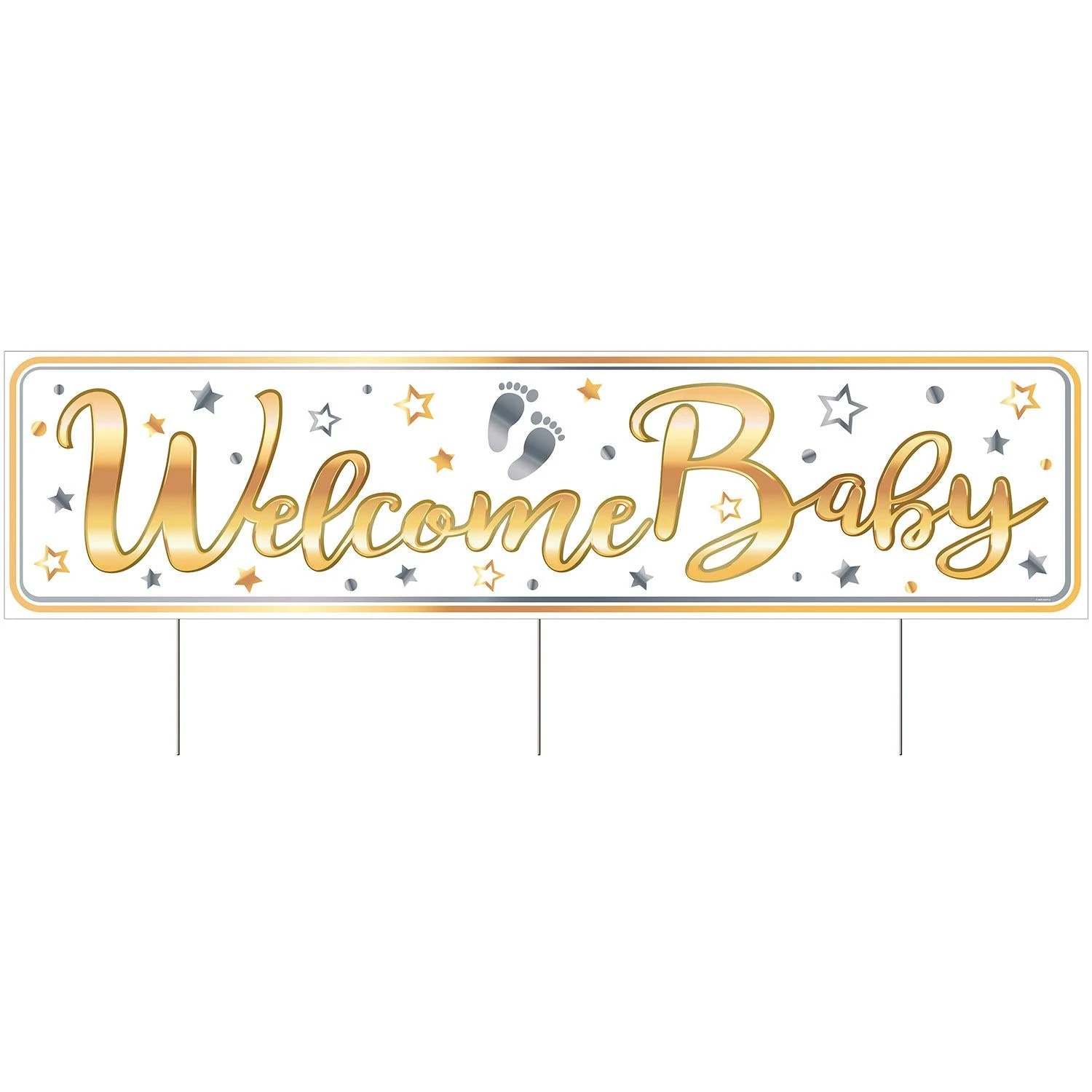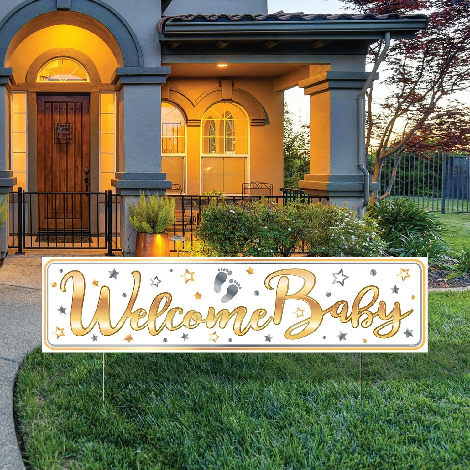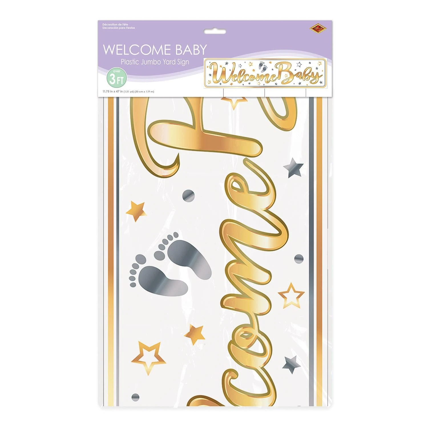 Product Description: Welcome your new bundle of joy with our Plastic Jumbo Welcome Baby Yard Sign! This tri-fold design comes with three metal stakes, making it perfect for outdoor display. Its all-weather design ensures it can withstand any weather condition, making it a perfect addition to your outdoor baby shower celebration. The sign measures 11.75 inches x 3 feet 11 inches and requires assembly. With one package per price, you’ll be sure to have a perfect outdoor welcome for your baby. Ships from Pennsylvania warehouse within one business day!
