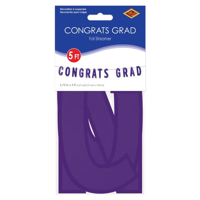 Our Purple Foil Congrats Grad Streamer is the perfect addition to your graduation events. These banners are ideal for creating a festive atmosphere. With dimensions of 6.75 inch x 5ft and packaging of 1/package, each case includes 12 packages, making it easy to cater to gatherings of any size. These versatile items enhance the ambiance of any celebration. Purple; assembly required.