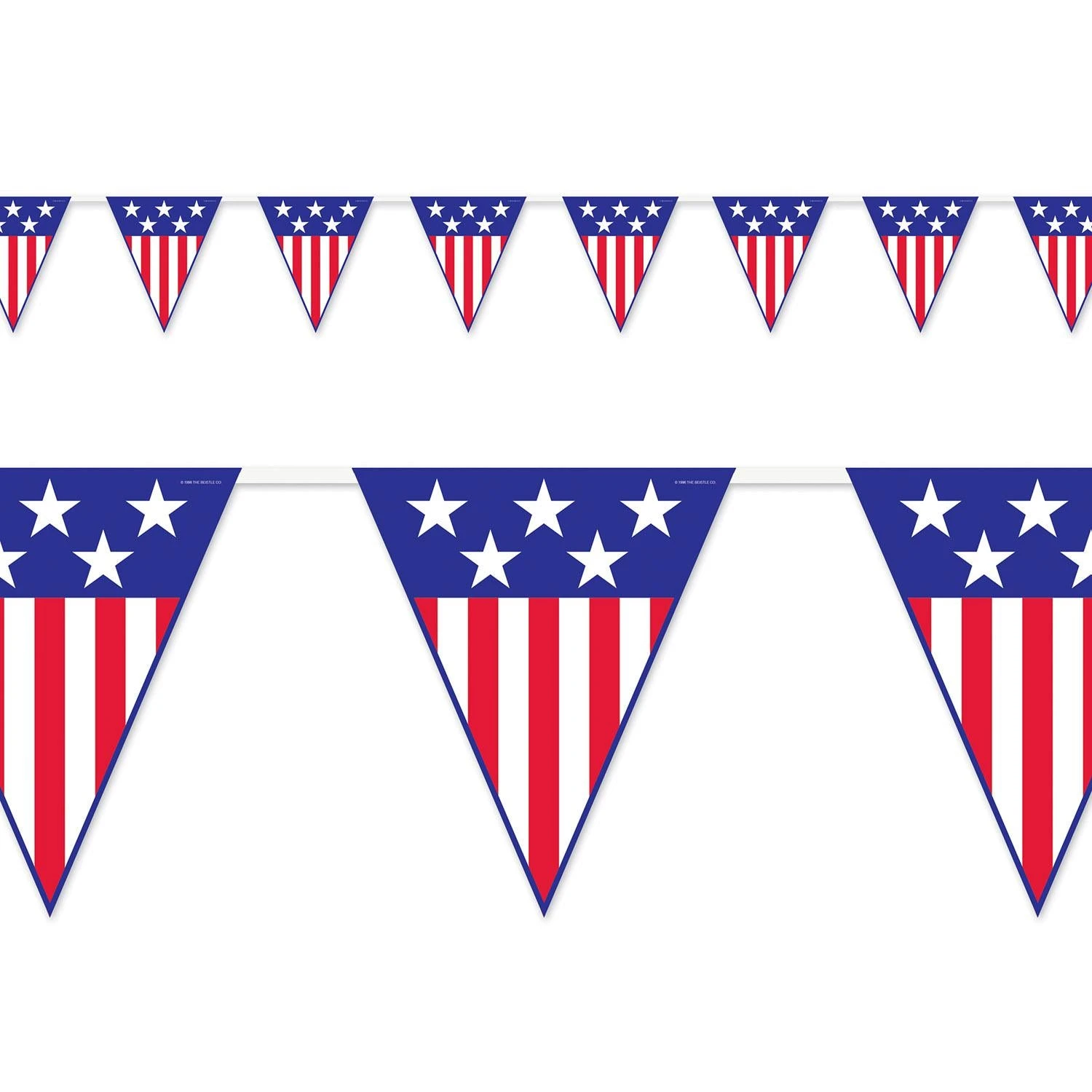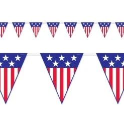 Product Description: The Spirit Of America Pennant Banner is the perfect way to add a touch of patriotism to any party or event. This plastic all-weather pennant banner features 12 individual pennants that measure 11″ x 12ft. making it ideal for both indoor and outdoor use. The Spirit of America pennant banner is perfect for patriotic-themed parties and is sure to be a hit with all your guests. With a package count of one per package, you’ll have enough to decorate any space. Plus, this item ships from our Pennsylvania warehouse within one business day, so you can get it fast and start decorating right away. Add the Spirit Of America Pennant Banner to your next patriotic-themed party and show your pride in the USA!
