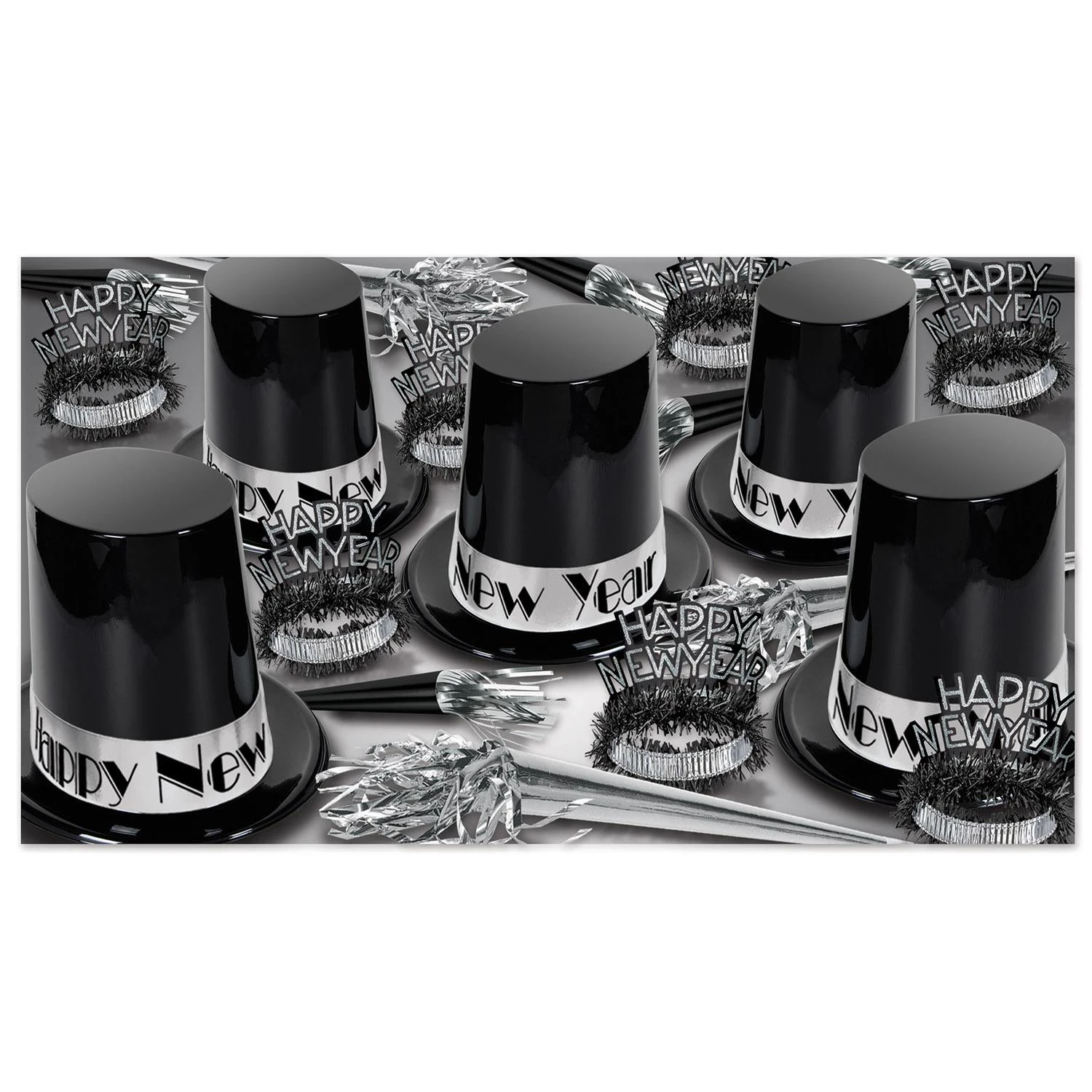 Make your New Year’s Eve celebration unforgettable with The Big Top Hat Silver New Year’s Eve Party Kit for 50 People from BulkPartySupplies.com! This complete party kit provides everything you need for a festive and stylish event. Featuring 25 oversized plastic toppers with printed foil bands, 25 glittered fringed tiaras, 15 impressive 25-inch tasseled foil trumpets, and 35 vibrant 9-inch tasseled foil horns, your party will be full of sparkle and excitement. Plus, it ships from our Pennsylvania warehouse within one business day, so you can plan your celebration with ease and confidence. Bring in the New Year with flair using The Big Top Hat Silver Party Kit!