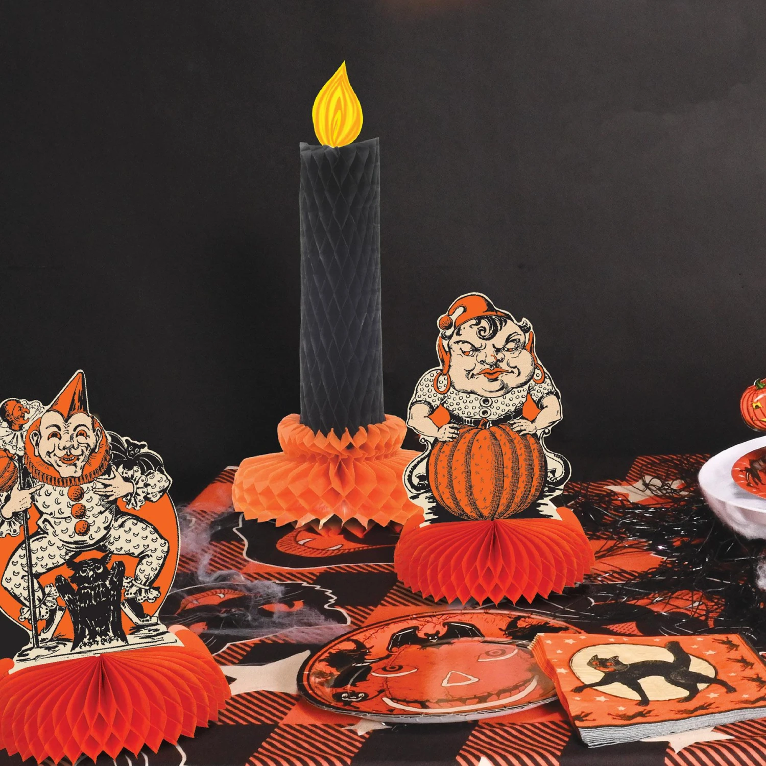 Info: The Vintage Halloween Centerpieces is party of our Halloween-Vintage line of party decorations and party supplies. First introduced in 1929, these highly detailed centerpieces have been reproduced by Our Company for current generations to enjoy. Featuring artwork depicting iconic vintage characters, each image printed on the front with the face side of the image, and the back features the corresponding rear image. Four centerpieces are included in each package. Easily displayed on tabletops, shelves, and other flat surfaces, the 9 inch tall centerpieces feature an orange honeycomb tissue base that opens to a diamter of 6 inches. Rarely seen today, the original designs are highly sought after by collectors, but these authentic BulkPartySupplies.com reproductions allow you to enjoy the same quality decorations for a fraction of the price. The vintage look of these timeless designs will lend a warm, nostalgic atmosphere to your Halloween decor.