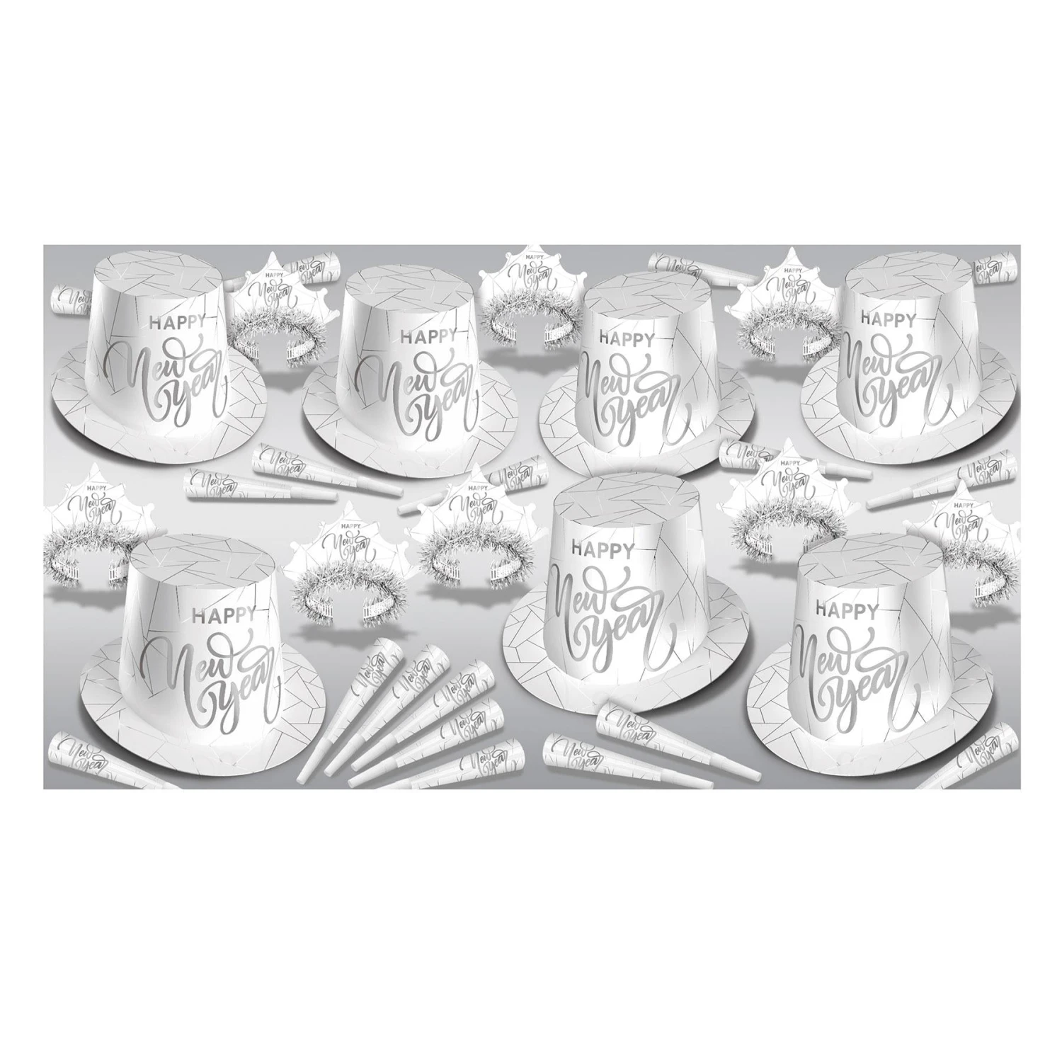 Ring in the New Year with style using the White New Year Silver Party Assortment for 50! Perfect for 50-person celebrations, this party kit has everything you need to create a night full of fun and excitement. Featuring 25 sleek printed foil hi-hats, 25 elegant foil fringed tiaras, and 50 vibrant 9-inch printed foil horns, your guests will be ready to celebrate in festive fashion. This 1 per case assortment ships quickly from our Pennsylvania warehouse, ensuring your supplies arrive on time. Make your New Year’s Eve party unforgettable with the White New Year Silver Party Assortment!